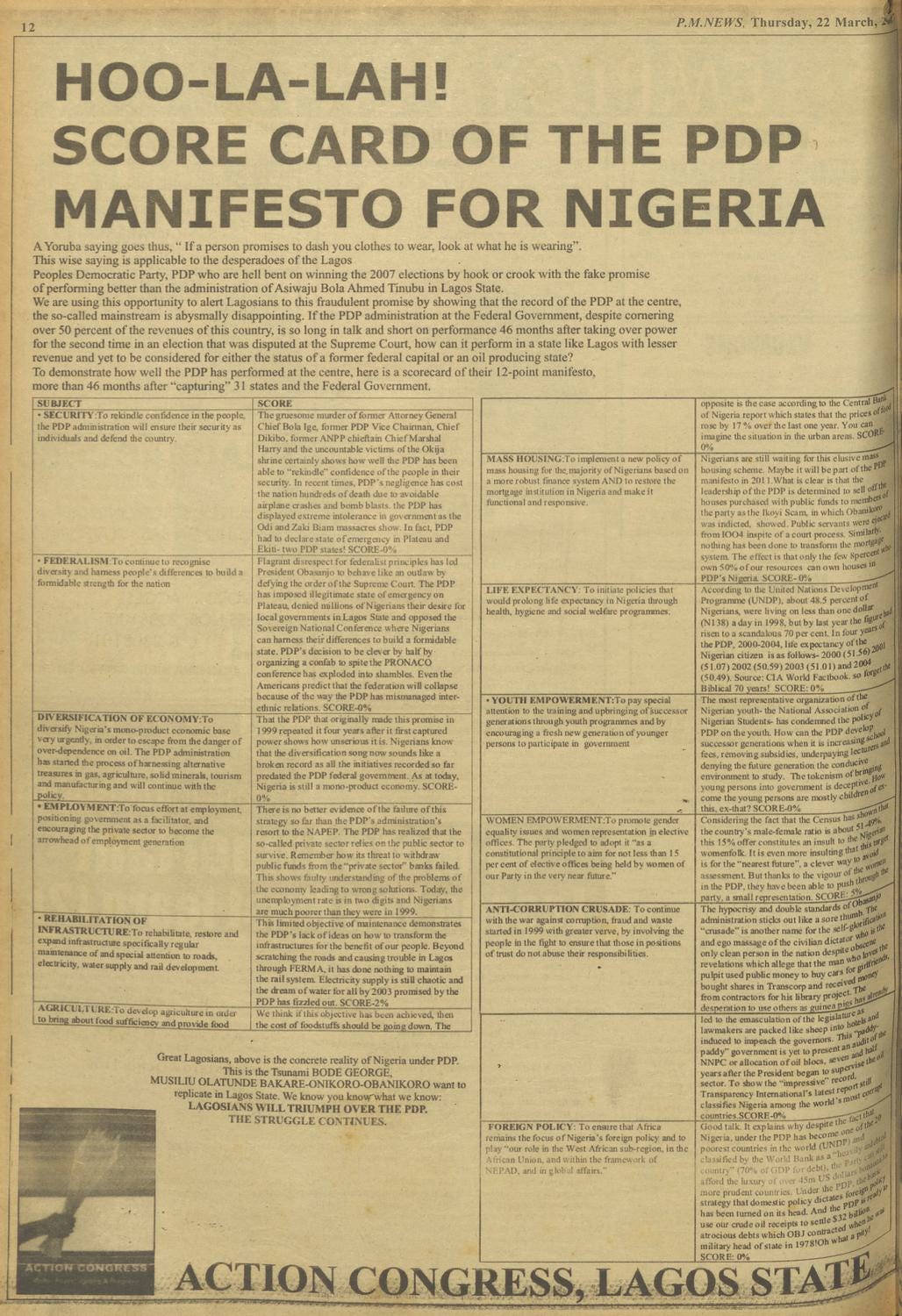 Nigeria’s political parties are short-sighted, working only over electoral cycles rather than planning for decades to ensure structured institutional change. This is why, despite 16 years of PDP rule and an upcoming 12-year anniversary for APC, there has been an uneven approach to governance. PDP’s manifesto, as appears on its website, still cites the hope of becoming one of the top 20 economies by 2020—a target that would make it a pioneer in time-travel politics. APC, Nigeria’s ruling party, does not even have a manifesto page on its website; instead, it focuses on its electoral superiority and an AI-generated image of the president. Because there is little accountability, they can afford to remain holding companies for electoral ambition.